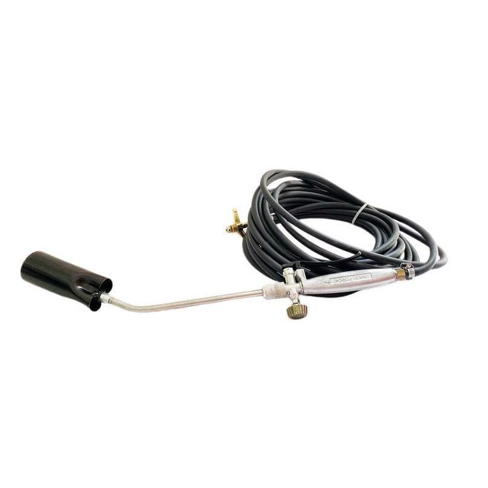 Maçarico com bocal queimador lança chamas completo desenvolvido para colagem de mantas asfálticas. Possui cabo com gatilho, válvula de chama piloto e mangueira para conexão a gás glp.