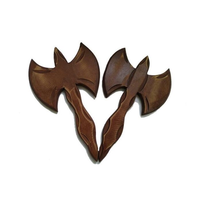 Machado Duplo de Xangô, Oxé. O Simbolo máximo do Orixá da Justiça e do trovão, Pai Xangô, que sempre está de olho em nossa ações e pronto para nos ajudar a fazer justiça. O Machado é de Madeira tratada, polida, com detalhes em ranhura. O kit vai com os dois machados.