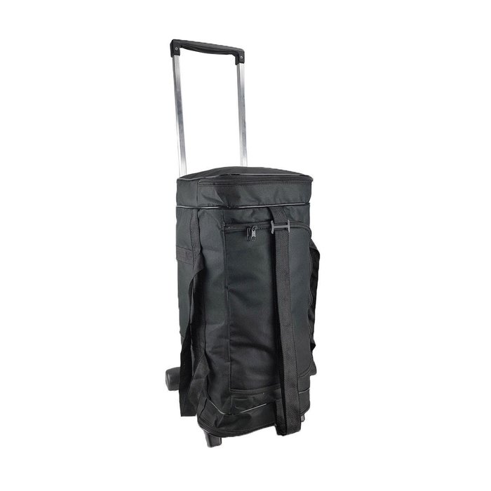A bolsa de viagem com carrinho é fabricada em material nylon 600 e serve perfeitamente como uma bagagem de mão, contendo 1 compartimento grande principal, dois bolsos laterais, um frontal menor, alça de mão e uma alça lateral para carregar no ombro com regulagem de comprimento.A roda do carrinho é fixa. Capacidade de 35l.
