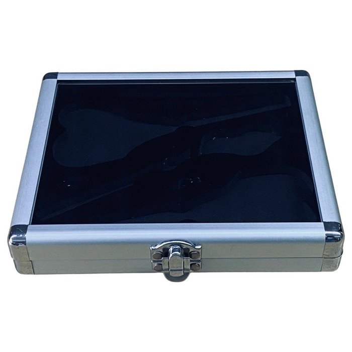 Esse estojo design moderno e elegante, feito em Napa prata e contornos em alumínio é resistente e bonita, revestida internamente em Napa preto com ótimo acabamento.