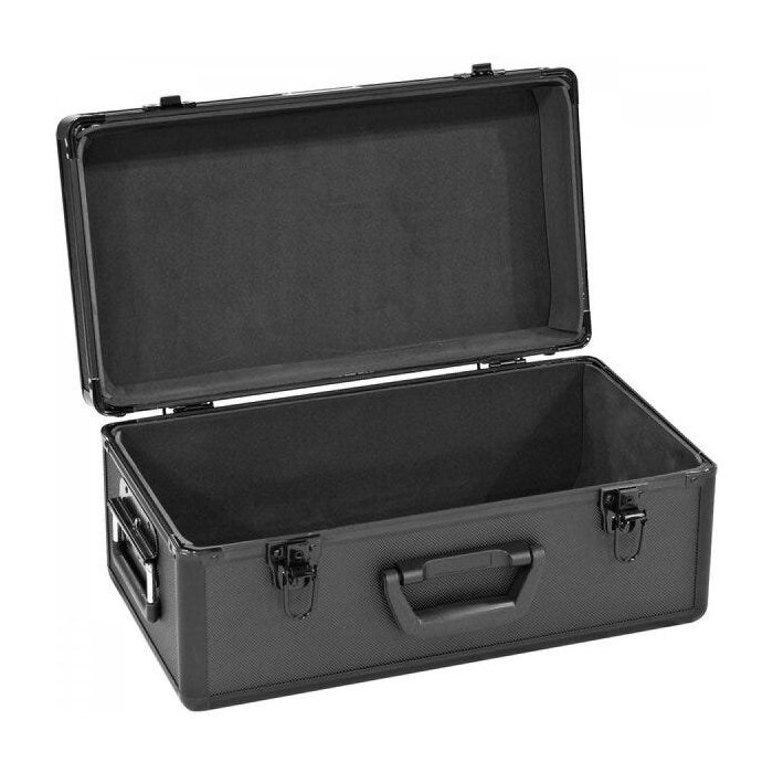 Possui estrutura rígida revestida externamente em alumínio na cor preta, além de cantos plásticos e laterais reforçadas com cantoneira de alumínio, conferindo maior durabilidade. Revestida internamente com material sintético macio (EVA). Conta ainda com 2 fechos com chave e dobradiças metálicas e 2 alças laterais retráteis com mola.