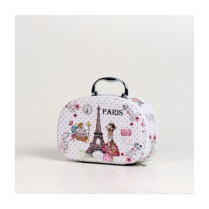 A maleta porta joias é uma excelente opção para guardar as joias que leva consigo em viagens. Além de muito bonita com desenhos que nos remete ao luxo de Paris, corações em baixo relevo feitos com glitter e estampa floral estão presentes. Sendo totalmente segura seu sistema de fechamento com zíper a torna muito pratica. Seu interior revestido de camurça na cor vermelho tem um bom espaço que permite armazenar tudo que você precisa e ainda conta com um espelho.