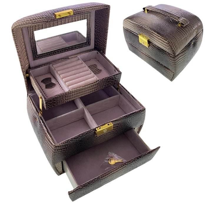 Maleta Porta Joias Bijuterias Relógio Estojo Organizador C/ Chave Espelho Alça Marrom
