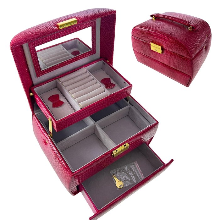 Maleta Porta Joias Bijuterias Relógio Estojo Organizador C/ Chave Espelho Alça Pink