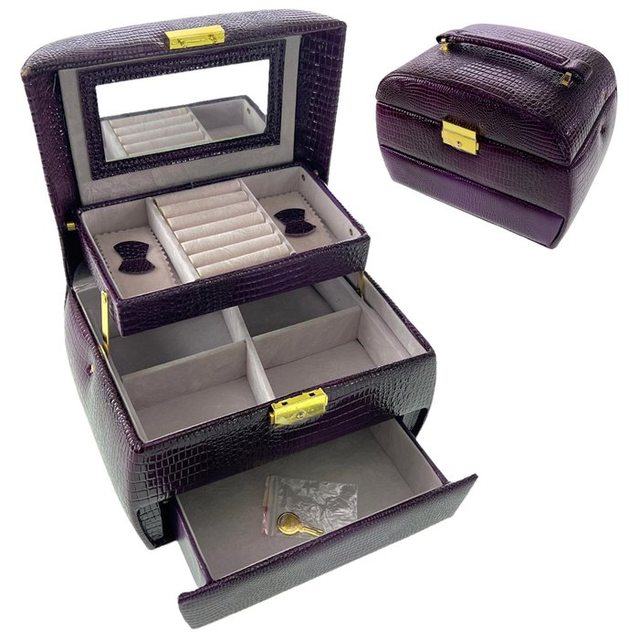Maleta Porta Joias Bijuterias Relógio Estojo Organizador C/ Chave Espelho Alça Roxa
