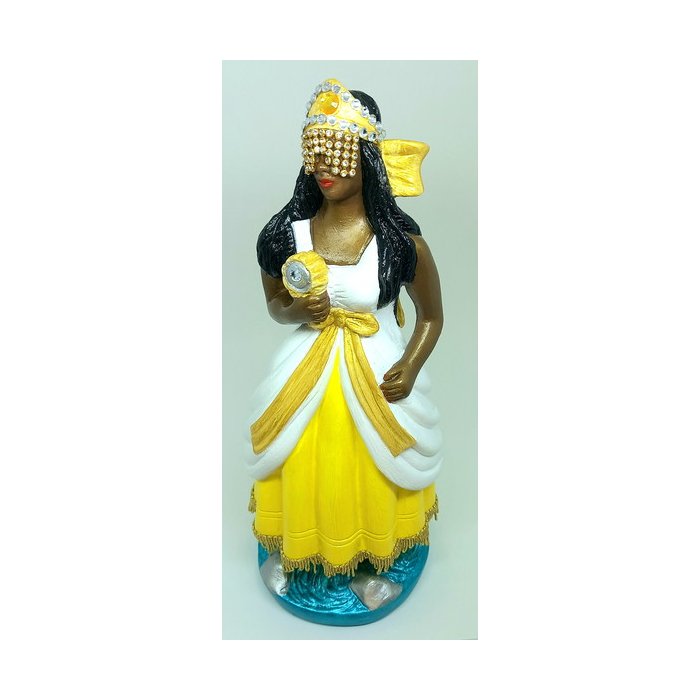 Imagem de gesso, toda estilizada á mão, impermeabilizada para que seja possível fazer consagração em cachoeiras, todo tipo de contato com água desde que não fique imersa por muito tempo para que não ofereça nenhum tipo de desgaste ou estrago aos outros apliques da peça.