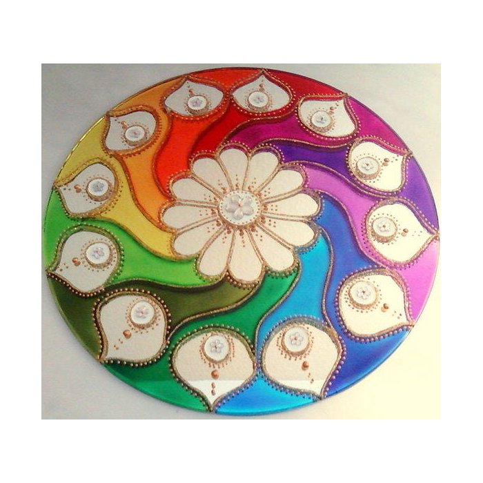 Espelho 25cm de diâmetro, técnica em vitral, decorado com flores em acrílico e tinta relevo dourada.