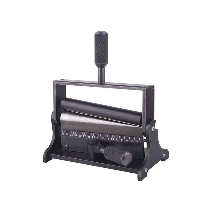A amostra é presa a um mandril cônico e é dobrada em torno do mandril por um rolo montado em um nível manual.