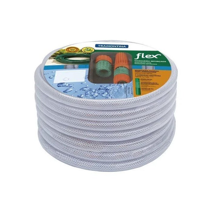Os produtos da marca Tramontina são reconhecidos em todo mercado por sua alta qualidade e pelo design, resultado da valorização da tecnologia e de uma busca constante por aperfeiçoamento. A Tramontina existe para desenvolver, produzir e entregar produtos de qualidade, que tornem melhor a vida das pessoas. Mangueira flex de 1-2 para jardim, engates rápidos e esguicho A mangueira flex Tramontina possui 3 camadas distintas: A camada interna em PVC, a intermediária em poliéster trançado e a externa em PVC Acompanha jogo com engates rápidos e esguicho.