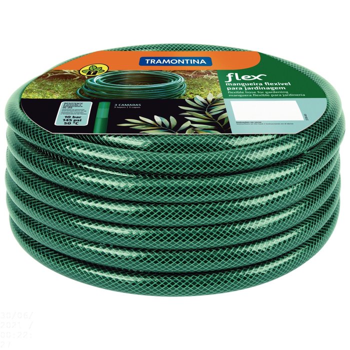 Se você deseja cuidar com mais praticidade e facilidade do seu jardim, a mangueira flex Tramontina verde em PVC 3 camadas 15 m é a ferramenta ideal para você. O produto possibilitará atingir os pontos mais difíceis na hora de irrigar o jardim devido a sua flexibilidade. Além de ser produzida com material altamente flexível, a mangueira é revestida por três camadas, sendo que a camada em poliéster evita que a mangueira torça. Qualidade e praticidade é com a Tramontina!