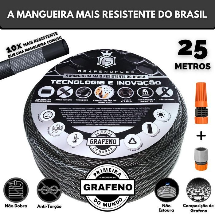 A linha de mangueiras GrafenoFlex é a primeira linha de mangueira no mundo a utilizar grafeno em sua composição. As mangueiras de jardim da GrafenoFlex são totalmente anti-torção, extremamente resistentes e contam com garantia de 5 anos, oferecida pelo fabricante. Se você procura qualidade, durabilidade e resistência para trabalhos no dia a dia, então as mangueiras da GrafenoFlex são a alternativa ideal para você