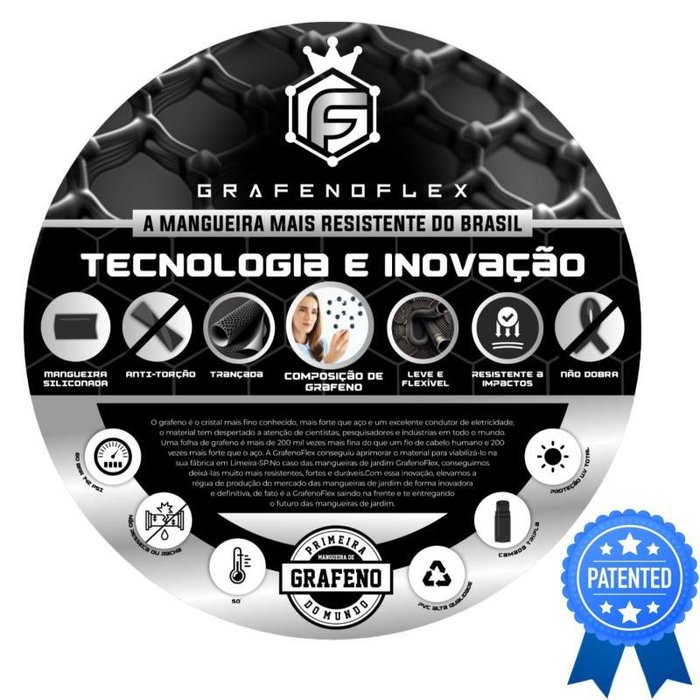 O grafeno é o material mais fino e resistente conhecido, mais forte que o aço e extremamente flexível, o material tem despertado o interesse de cientistas, pesquisadores e industrias em todo o mundo. Uma folha de grafeno é mais de 200 mil vezes mais fina que um fio de cabelo humano e 200 vezes mais forte que o aço. A GrafenoFlex conseguiu aprimorar o material para viabilizá-lo na fabricação de novos produtos inovadores. No caso das mangueiras de jardim GrafenoFlex, conseguimos deixá-las muito mais resistentes, fortes e duráveis.