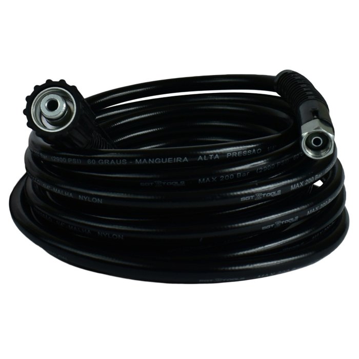 Mangueira para lavadoras de alta pressão, resistente e flexível, ideal para uso em limpezas pesadas. Oferece durabilidade, alta resistência a abrasões e pressão, garantindo um fluxo de água constante e seguro. Compatível com diversos modelos de lavadoras.
