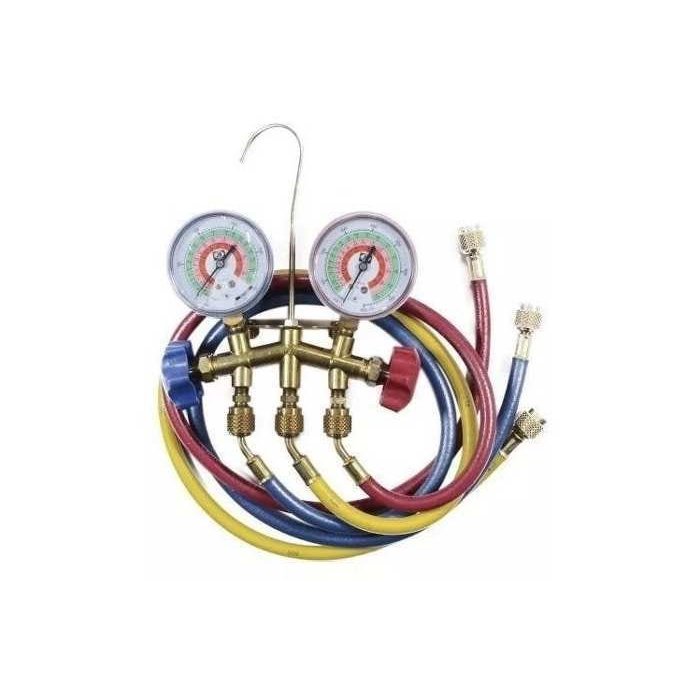 Equipamento que acompanha 2 manômetros e 1 kit de mangueiras (com 3 mangueiras). Utilizado para medir a pressão de determinado gás no sistema durante a manutenção do mesmo. Também é conhecido como analisador de gás. Podem analisar diferentes gases de acordo com a escala indicada no manômetro.