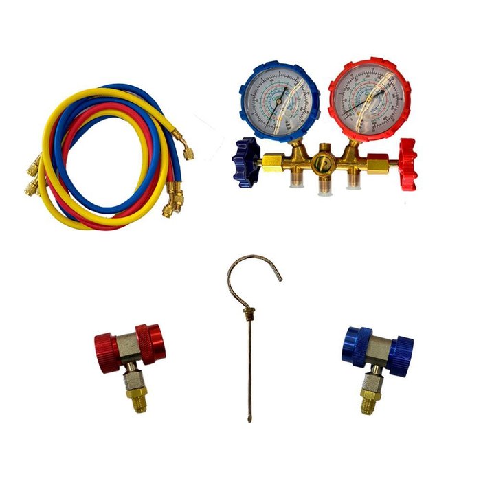 Tipo de Manifold: AutomotivoCompatibilidade de Gás: R134Número de Mangueiras: 2 (Alta e baixa pressão)Escalas de Medição: Inclui manômetros para leitura precisa das pressões
