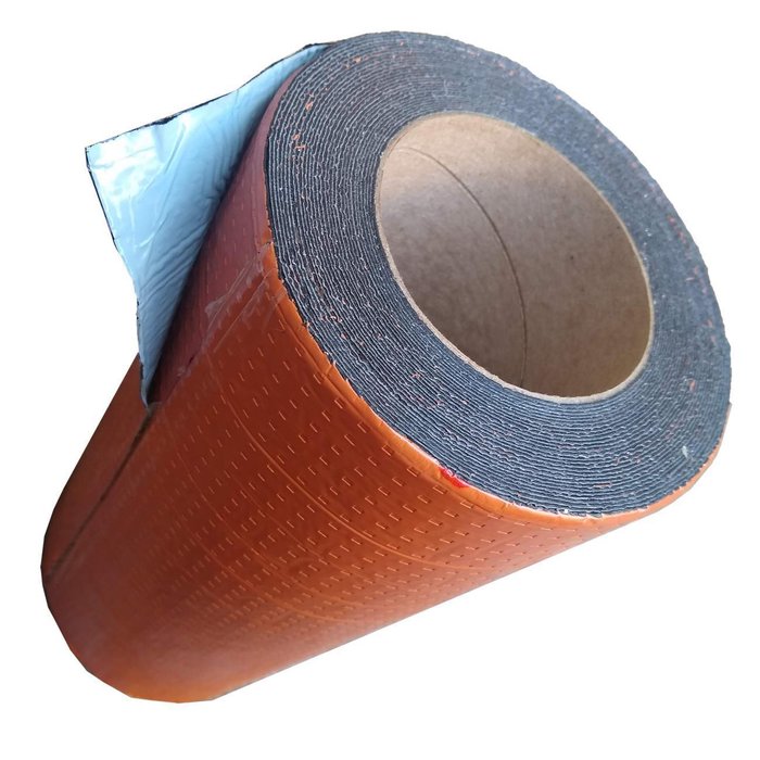 Fita autoadesiva multiuso à base de asfalto protegida com filme na cor terracota que permite sua exposição a intempéries e aos raios solares, para solucionar problemas de gotejamento e vedações.