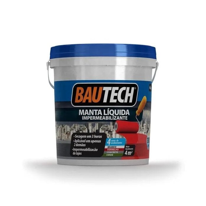 BAUTECH MANTA LÍQUIDA é um produto formulado com o que há de melhor no mundo em emulsão acrílica pura, com alto poder de alongamento. Após a secagem, forma uma membrana flexível, elástica, impermeável, contínua e de alta performance.