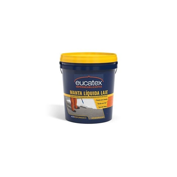 Manta Líquida Emborrachada para impermeabilização de lajes e telhados.Manta Líquida Emborrachada é um produto de alta performance para aplicação a frio, que forma uma membrana elástica impermeável, resistente a ação de intempéries. Contribui para a redução da temperatura em lajes e telhados atuando como isolante térmico, pode ainda ser usada em lajes, telhas de amianto, telhas galvanizadas, caixas d'água cimentícias, rufos e calhas.Acabamento: fosco.Superfície: • Alvenaria• Lajes• Telhas galvanizadas• Caixas d'água cimentícias• Rufos e calhasDiluição: Com água• 10% na primeira demão, demais aplicar puroRendimento: Balde 18kg: até 18m² por demãoDemãos:• 2 a 3 (Cruzadas)Secagem:• Entre demãos: 3 horas • Final: 12 horasAplicação: • Rolo de textura• Brocha• TrinchaDicas e Preparação da Superfície:De acordo com a norma ABNT NBR 13.245.A superfície deve estar firme, coesa, limpa, seca, sem poeira, materiais gordurosos, sabão e mofo.• Regularize a laje com argamassa de cimento e areia traço 1:3, como caimento mínimo de 1% em direção aos condutores de águas pluviais e arredonde os cantos (meia cana).• Impermeabilize até 30 cm em paredes e tubulações, e recubra muretas até 60 cm de altura.• Dilua a primeira demão (demão de imprimação) em 10% de água para proporcionar melhor penetração do produto no substrato. Nas outras demãos, o produto deve ser aplicado sem diluição.OBSERVAÇÕES1. Áreas sujeitas a movimentação, como lajes pré, juntas e trincas, devem receber um reforço entre a primeira e a segunda camada com tela poliéster.2. O rendimento prático do produto pode variar em função do método de aplicação, geometria da estrutura, rugosidade e absorção da superfície, espessura da camada de produto depositada, condições atmosféricas e técnica de aplicação.3. Visto que os serviços de impermeabilização requerem conhecimentos específicos, recomenda-se que sejam executados por profissionais habilitados.4. Aplicar com tempo estável.5. A cada 20m de aplicação deve receber um reforço com tela poliéster.6. Evite a aplicação do produto em dias chuvosos, com temperatura abaixo de 10ºC ou acima de 40ºC e umidade relativa do ar superior a 90%.7. Não indicamos a utilização combinada, ou em mistura, com outros produtos não específicos nesta embalagem.8. Aplicação em caixas d'águas recomendamos aguardar 5 dias para liberação.9. Em locais com tráfego de pedestre ou veículos, deve receber proteção mecânica.
