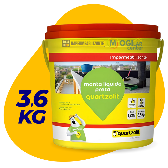 Manta Líquida Laje Telha 3,6l Impermeável Emborrachada Preta Manta líquida preta Quartzolit é uma membrana asfáltica para a impermeabilização de superfícies, como concreto, argamassa, alvenaria, superfícies metálicas e madeira. Pode ser utilizado para a impermeabilização de lajes de coberturas, impermeabilização de substratos cimentícios em áreas molhadas, como banheiros, cozinhas e áreas de serviço. Além de mastique para calafetar de juntas de pisos de concreto. Inibe a presença de umidade nos elementos impermeabilizados.Excelente aderência aos substratosFacilidade de aplicaçãoSobre esse produto: Verifique a temperatura de trabalho:Temperatura ambiente entre 5 °C e 35 °C.Temperatura da base entre 5 °C e 27 °C. Não aplique sob incidência solar ou sobre base quente.O consumo recomendado deve ser respeitado em, no mínimo, duas demãos.Proteja peças de alumínio.Verifique suas ferramentas de trabalho.Use EPIs. Características e Benefícios• Inibe a presença de umidade nos elementos impermeabilizados• Excelente aderência aos substratos• Facilidade de aplicação Contra Indicados Para:• Uso como acabamento• Ficar exposto ao sol• Grandes áreas