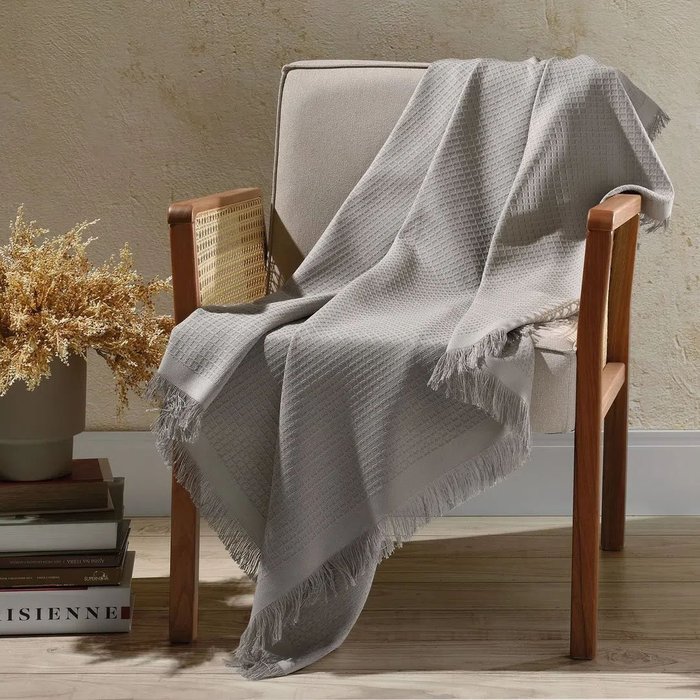 Manta decorativa encorpada com texturas trabalhadas e acabamento em franjas ao longo das extremidades. Por ser 100% algodão proporciona conforto e qualidade, além da versatilidade de utilizar em ambientes variados.