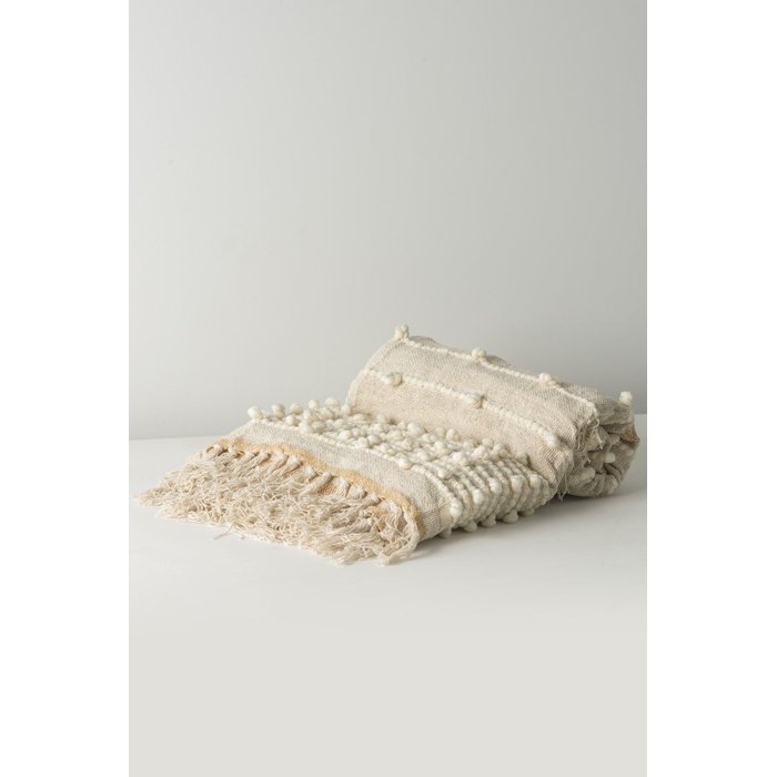 Esta manta possui tramas feitas à mão e uma cor neutra que funciona em vários ambientes.