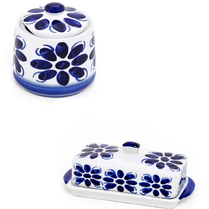 Manteigueira Retangular e Açucareiro Pintada a Mão Colonial Porcelana Monte Sião azul