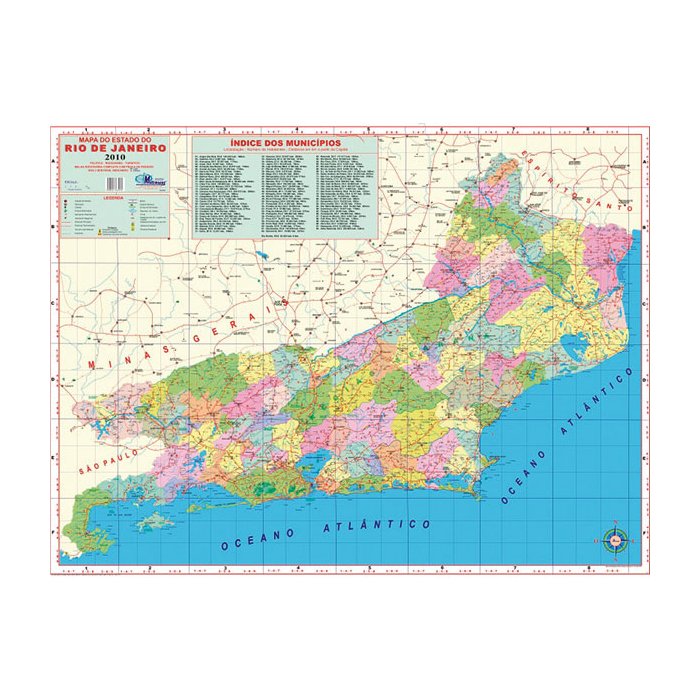 Mapa escolar do estado do Rio de Janeiro.Mapa dobrado, com divisão política, contendo todas as cidades do estado, todas suas divisas, população e principais estradas do estado.120cmx90cm.