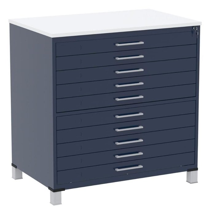 Mapoteca 10 Gavetas Pandin 120 Cm (larg) Inmetro Tampo Mdp Branco Estrutura E Gavetas Em Aço Azul
