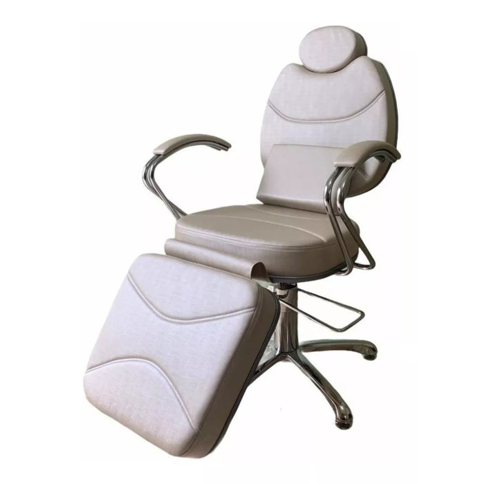 Poltrona com designer lindo reclinável, fabricada com espuma de ótima densidade, estrutura em ferro cromado, braços cromados com descanso de perna almofada reclinavel, revestida em courvim com ótima qualidade, sistema hidráulico com regulagem de altura e trava com modelo de base em estrela, cabeçote removível e regulagem de trava.