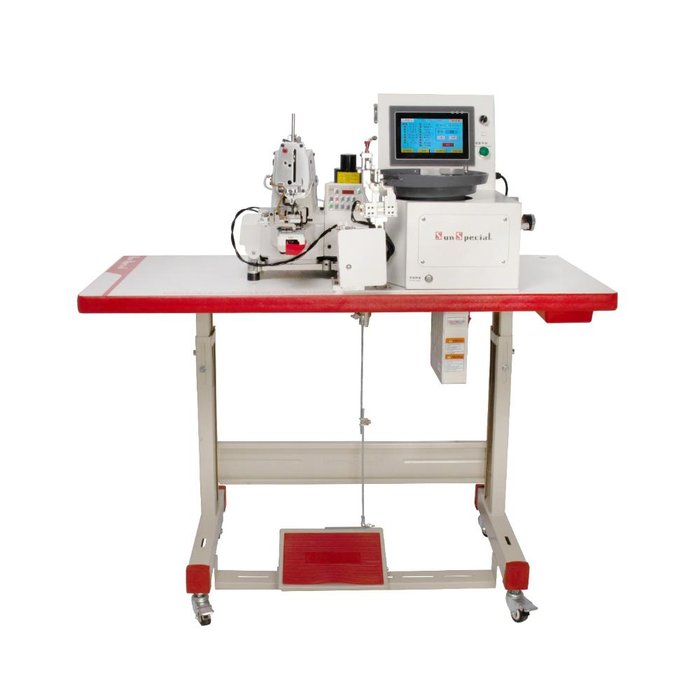 Máquina Costura Industrial Botoneira Direct Drive com Corte de Linha e Alimentador de Pregar Botões em Pe 220v SS373D-H-BU-SU - Sun Special Máquina de costura industrial botoneira de ponto corrente para pregar botões de 2 e 4 furos, com corte de linha automático para uso em todos os tipos de tecidos. Ideal para aplicar botões em camisas, blusas, calças, saias, roupas em geral, etc. Pode ser utilizada para outras aplicações, como colocar lacinhos ou enfeites, etiquetas, fixar aviamentos em geral, entre outras. - Motor: Direct Drive - Tensão: 220V - Velocidade máxima: 1.500 ppm - Número de agulhas: 1 - Tipo de agulha: TQx7, TQx1 - Diâmetro do botão para prega: 10 a 27 mm - Área de trabalho: 6,5 x 6,5 mm - Número de pontos: 8,16,32 / 6,12,24 - Prega botões de 2 e 4 furos - Corte de linha automático - Lubrificação manual - Controle da quantidade de pontos Direct-Drive ligado diretamente ao eixo principal, proporcionando assim mais agilidade, economia e menos ruídos no ambiente. Acompanha mesa e motor.