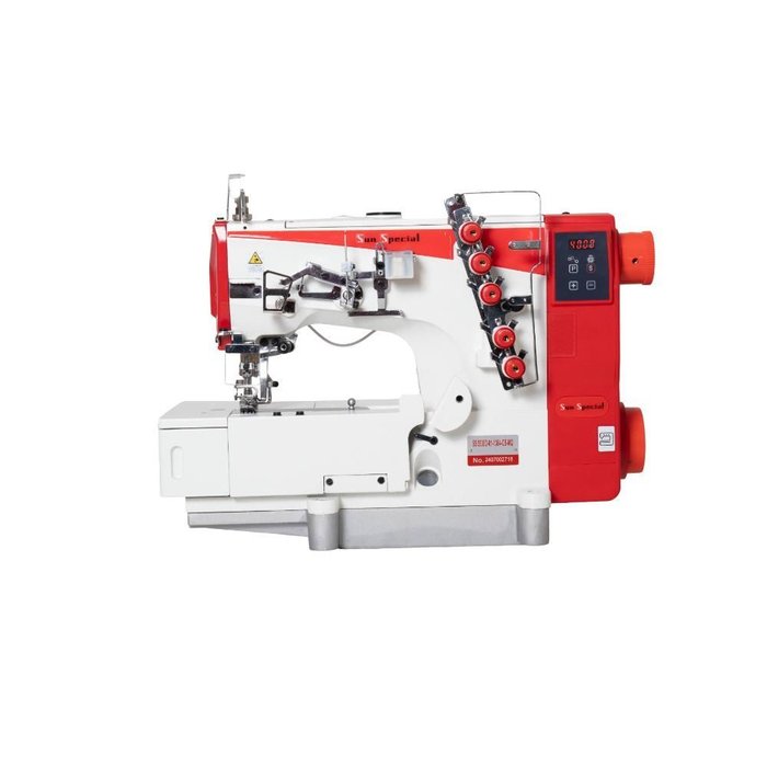 Máquina de Costura Industrial Galoneira Plana SS5500D-01-1364-CB-MQ 220V - Sun Special Máquina de costura industrial gaoneira plana SS5500D-01-1364-CB-MQ para confecção de vestuário com tecidos leves e médios. - Tipo galoneira - Quantidade de agulhas: 03 Agulhas - Velocidade máxima de 5.500 RPM - Base plana fechada - Voltagem: 220V - Sistema microprocessado direct drive - Completa com acessórios - Control box acoplado ao cabeçote Acompanha mesa e motor.