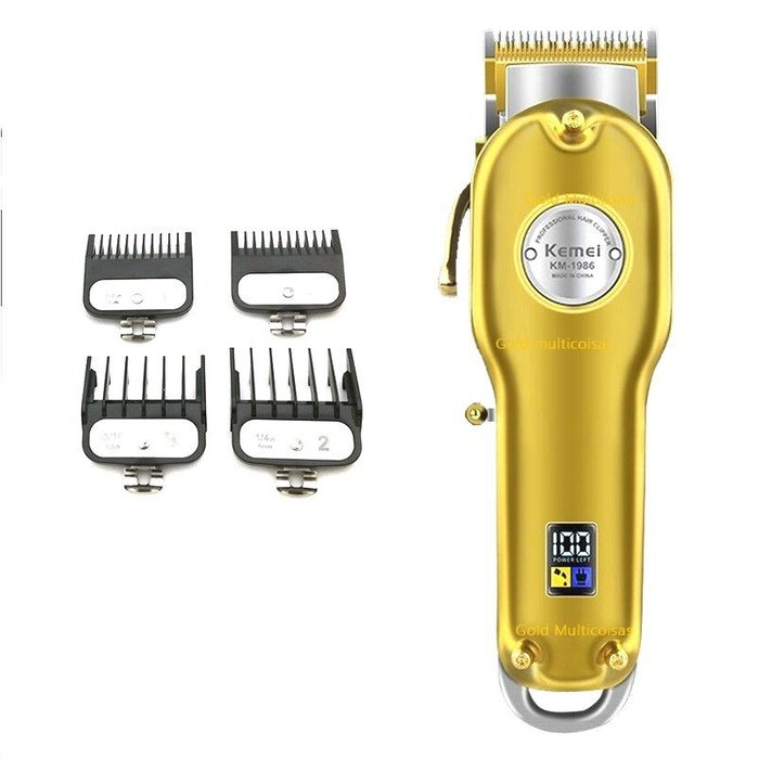 Máquina de Cortar Cabelo Elétrica sem fio profissional Kemei Km-1986 Maquina possui visor digital com a carga da bateria. Marca: Kemei Modelo: KM-1986 Cor: Gold Largura da lamina: 45mm ( 4,5cm) Lamina: Cabeça de Cortador de Aço Inoxidável Tamanho do corpo: 17. 5 cm * 4 cm Peso corporal: 438g Tamanho da embalagem: 24 cm * 17 cm * 8,5 cm Peso total: 987g Lamina: FADE Potencia: 8w Bateria: Lition 2500 mAh Tempo de carregamento: 3 Hrs Pode utilizar durante o carregamento. Autonomia da bateria: 300 minutos aproximados Material do corpo: Corpo Galvanizado Voltagem: 110-240 V ( Bivolt ) Método de carregamento: Plug And Play Itens na embalagem: 1 x Maquina Kemei 1986 Profissional. 4x Pente 1,5, 3, 4,5, 6mm 1x Protetor de Lâmina, Escova de Limpeza, Carregador Bivolt ( Fonte ), Manual do usuário (idioma inglês).