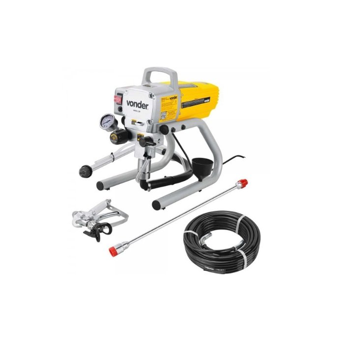 1 Máquina de pintura, acompanha: 1 mangueira com 15 m, 1 pistola de pintura (bico 517 e filtro interno malha 60) e 1 tubo extensor para pintura.