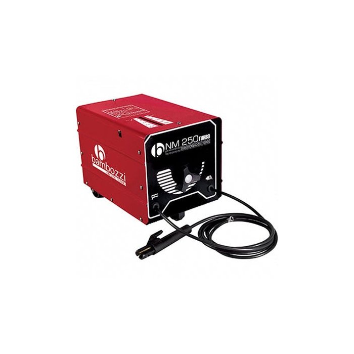 MÁQUINA DE SOLDA BAMBOZZI NM250 TURBO Referência: 10810204206464 Modelo: NM250A TURBO Marca: BAMBOZZI País de origem: BRASIL Potência: 55A / 250A Voltagem: 220V Dimensões CxLxA: 50x29x32 cm Peso: 30 Kg Notas:Monofásica , tensão de circuito aberto 50v , fator de trabalho 250a a 20por cento , solda eletrodos com corrente alternada até 3,25mm , com ventilação forçada , 29kg obs. solda aço carbono