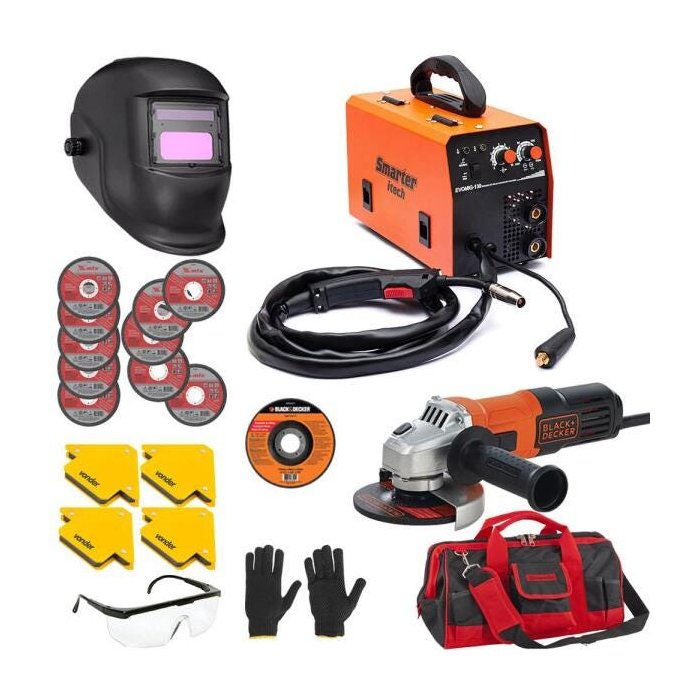 | Conteúdo da Embalagem | 01 maquina de solda, 01 mascara automática, 01 esmerilhadeira lixadeira 4.1/2``, 10 discos de corte, 01 esquadro magnético 10 kg, 01 par de luvas de malha, 01 óculos de proteção e 01 bolsa em lona para ferramentas. |