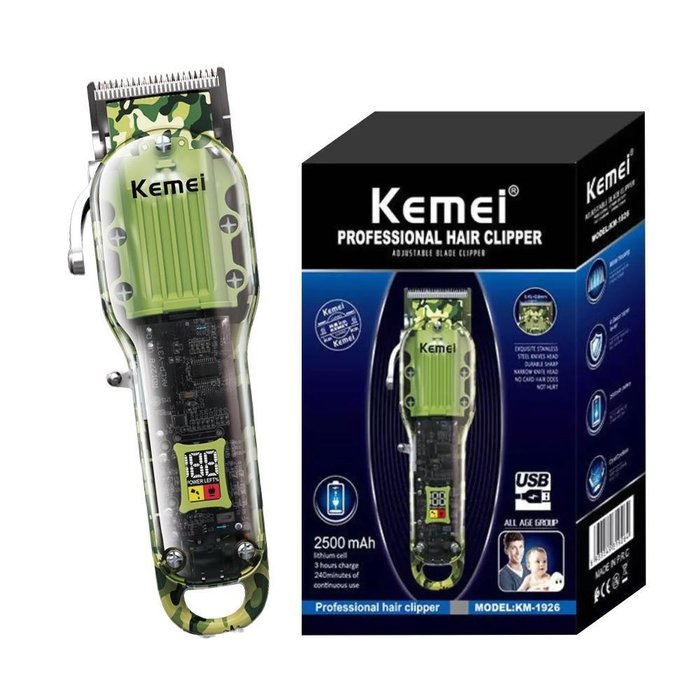 SUPER DESIGN: Com o tamanho ideal para o encaixe nas mãos e um design camuflado diferenciado, a Kemei KM-1926 agregará ainda mais valor aos seus cortes!