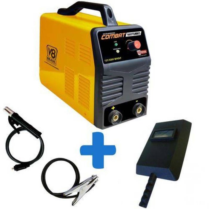 Maquina Solda Inversora 160a Turbo Bivolt 110/220v V8 Brasil Com alta tecnologia, as Soldas Inversoras Combat da V8 Brasil são máquinas ideais para quem precisa de qualidade, mobilidade e alto rendimento.Vantagens:Facilidade de utilização;Cabo de alimentação com plug macho + Terra Padrão Abnt(Plugue em qualquer tomada 20A de sua casa ou oficina!)Solda Ferro, aço carbono, aço inox e ferro fundido;Consumo de energia elétrica menor que o de um equipamento com transformador;Ideal para soldagens em lugares altos, pelo baixo peso e mobilidade dos equipamentos;Alto rendimento, soldando com eletrodos revestidos 6013;Fácil de carregar;Solda limpa e com arco extremamente estável. Especificações Técnicas:Tensão de entrada: BivoltFaixa de corrente (A): 20-160 Ciclo de trabalho (%): 160A = 30% - 95A = 60% - 75A = 10% Potência: 3,4KVAPeso: 4 kg Tamanho: 38 x 12 x 20 cmAcompanha:Inversora Combat Turbo 160Cabo de alimentação plug machoCabo TerraEscudo de Solda (ATENÇÃO: Promoção válida para compras a partir do dia 13/07/2017 às 15h00)Perguntas FrequentesEla solda Alumínio?Não solda alumínio.Ela solda Inox?Sim, ela solda Inox.Qual a espessura que ela solda ?Ela solda chapas de até 6 mm de espessura.Quais eletrodos que eu posso utilizar nela ?Eletrodos nos modelos 6013 e 7018 de até Ø 3,25mm.Posso pagar em 12x ?Pode sim! Vendemos em 12x no cartão de crédito.Vocês vendem eletrodos para ela ?Infelizmente no momento nós dispomos apenas da máquina, porém podem ser encontrados em lojas de insumo para esse tipo de equipamento.A máquina é para uso profissional ?Sim! Máquina 100% profissional.Qual o comprimento dos cabos ?Os cabos de Terra e Porta eletrodo possuem 1,50m.Vendem a pronta entrega?Sim, todos nossos produtos são vendidos a pronta entrega.