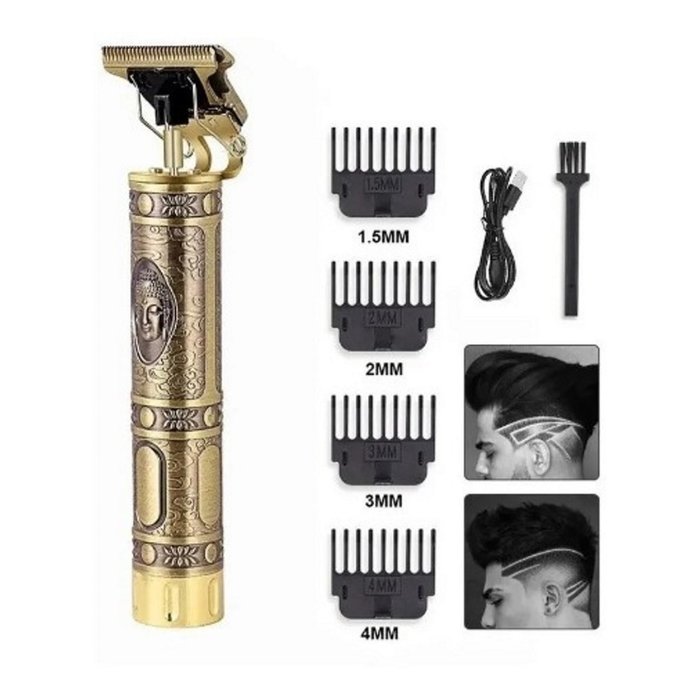 Máquina de Acabamento Profissional em Metal, proporciona um Barbear Suave e uniforme em poucos segundos, com lâminas mais avançadas do mercado e máxima precisão sem enroscar ou puxar nenhum fio.Lâminas de suspensão em forma de T segura, que fazem um barbear e um cortar livremente, não importa a partir de qual direção.Especificações:Potência: 3wTensão: 3.7VCor: Dourado EscuroTempo médio de uso: 2 horasCapacidade da Bateria: 1200 mahMedidas: Altura 15 Cm, Largura 2,8 CmTempo médio de carregamento: 3 horasMétodo de carregamento: Carregamento USBModelos Aleatórios Disponíveis: Águia, Buda e DragãoEmbalagem:04 x Pentes01 x cabo USB01 x Cortador de Cabelo01 x Pincel de Limpeza