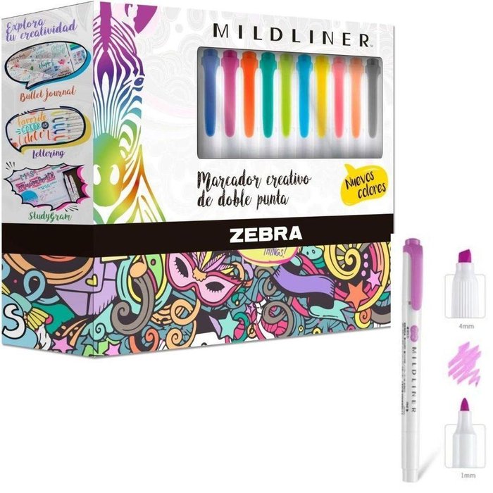 MARCA TEXTO MILDLINER - PONTA DUPLA - 4015-68 - 25 CORES - ZEBRA O MILDLINER da Zebra apresenta uma cor suave única que aparece delicadamente no papel e uma ponta larga e fina para todas as aplicações de lettering à mão e marcação.