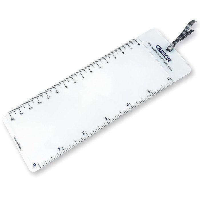 A MagniMark™ de Carson, com ampliação de 3x, é perfeita para ler livros, revistas e telas de computador. Com uma régua integrada de 15 cm, ela serve como uma lupa versátil para leitura e uma ferramenta útil para idosos.Leve e compacta, essa lupa de leitura é ideal para uso em movimento.O compromisso da Carson com a qualidade garante uma ampliação clara e conveniente para todas as suas necessidades de leitura.Ampliação de 3x com Régua Integrada - A lupa Fresnel compacta com régua de 15 cm é ideal para ler letras pequenas em livros, jornais e revistas. Inclui marcações em polegadas e centímetros.Design Multifuncional - Funciona como lupa de página e marcador de livro, sendo perfeita para idosos ou qualquer pessoa com baixa visão.Leve e Portátil - Cabe facilmente em uma bolsa, bolso ou mochila, oferecendo ampliação conveniente para leitura em movimento.Aplicações Versáteis - Adequada para leitura, ampliação de telas de computador e outras necessidades de baixa visão, proporcionando clareza e visibilidade aprimorada do texto.Ferramenta Essencial do Dia a Dia - Ótima para uso em casa, no escritório, em viagens ou como presente, oferecendo praticidade e conveniência para qualquer leitor.Com 25 anos de expertise em ótica, Carson oferece a MagniMark™ com ampliação de 3x, uma ferramenta versátil para leitura. Esta lupa de leitura possui uma régua integrada de 15 cm, tornando-se ideal como lupa de livro e para idosos.Seu design compacto e lente Fresnel a tornam perfeita para uso em movimento, seja como amplificador de telas de computador ou de páginas. Confiada por profissionais e amplamente utilizada por idosos, a inovação da Carson garante clareza e conveniência em cada produto.ESPECIFICAÇÕES TÉCNICAS: