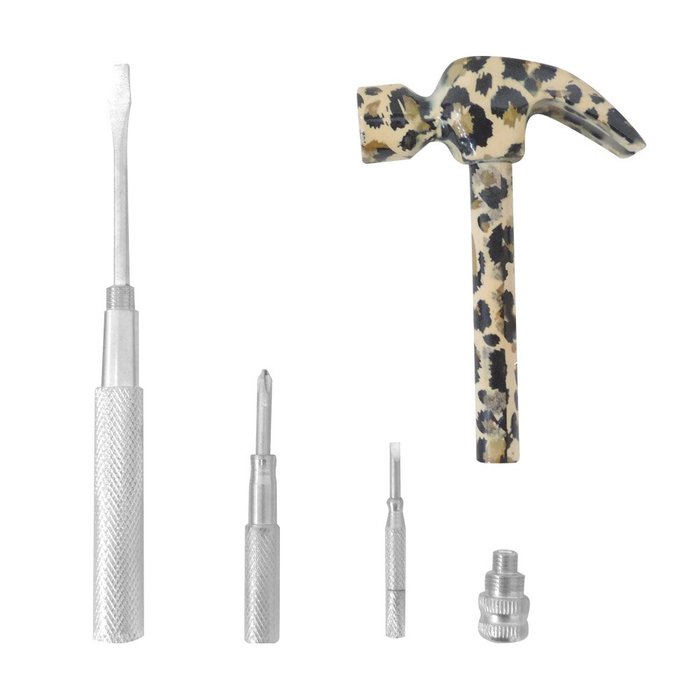 Martelo artesanato 5 em 1 Colorido, cabo serrilhado para manuseio firme e seguro. Tem 4 tamanhos de chaves de fenda alocados dentro do cabo. Leve e de fácil manuseio.