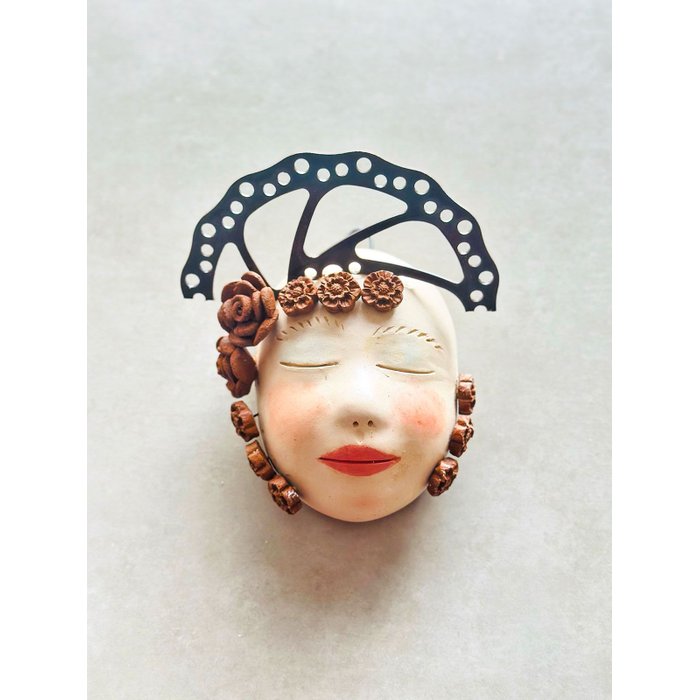 Máscara de Mulher da artista plástica Nené Cavalcanti, feita à mão em cerâmica e metal. A peça é levada para queima em um forno específico para cerâmica, que faz com que ela mude de tonalidade e se transforme nos tons de vermelho, branco, amarelo, rosa, etc.