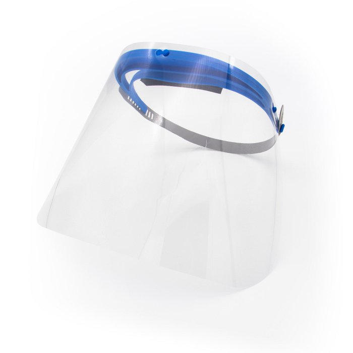 5 unidades;Suporte injetado em polipropileno;Ajuste de cabeça com diversos níveis com trava;Visor confeccionado em PP de alta resistência e transparência;Lavável e reutilizável;Dimensões: 25 x 35 x35 cm;A máscara vai embalada individualmente em polybag transparente com manual de instruções