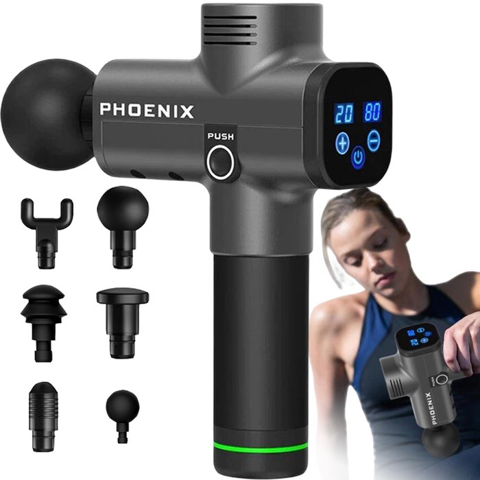 A Pistola Massageadora Muscular Phoenix A2 é um aparelho de massagem com 6 ponteiras e visor LCD, que através da vibração, sem utilizar fio, alivia a dor, a tensão muscular, aumenta a circulação sanguínea e melhora a saúde dos tecidos corporais, além de ser uma ferramenta utilizada por profissionais fisioterapeutas e esportistas, sendo criada para clientes que buscam uma massagem muscular com máximo potencial.
