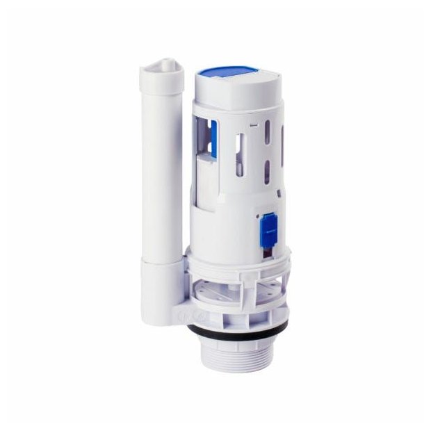 Mecanismo de saída para caixas acopladas com acionamento superior duplo acionado por haste. Sistema ideal para o uso racional e economia de até 50% de água. Permite escolher a descarga de 3 L ou 6 L, conforme a necessidade de limpeza da bacia.Extravasor com altura ajustável (ladrão). Compatível com qualquer modelo e marca de caixa acoplada.