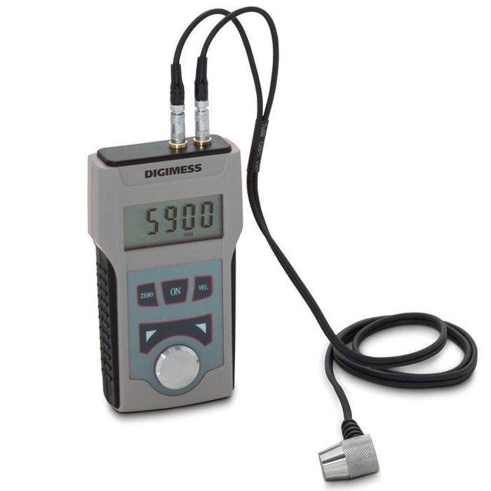 Medidor de Espessura por ultrassom (0,1mm) 1,2-225mm - Analógico Ref. 400.150-NEW Descrição geral - Usado para medir espessura de aço, ferro, alumínio, cobre, latão, zinco, vidro, plástico, entre outros;- Capacidade de 1,2 a 225mm (com a sonda padrão, em aço);- Realiza medições em peças cilíndricas a partir de Ø20mm, com parede a partir de 3mm (com a sonda padrão, em aço);- Exatidão de ±(1%H+0,1)mm, onde H é a medição que você está fazendo;- Função de calibração (zeragem) da sonda, através de padrão acoplado no corpo do medidor;- Ajuste da velocidade do som de 1000-9999m/s;- Função para descobrir a velocidade do som de amostra conhecida;- Memória para 5 velocidades do som mais utilizadas;- Memória e visualização no display para 10 medições;- Conversão de unidade milímetros/polegadas;- Permite a temperatura na superfície da peça de -10 a +60ºC;- Indicação de baixa carga das pilhas no display;- Desligamento automático após período sem uso;- Teclado protegido contra óleo e poeira. Acompanha - Sonda reta 5 MHz, com área de contato de Ø10mm;- Sonda em L (90º) 5MHz, com área de contato de Ø10mm;- Pasta (gel) para acoplamento;- Pilha tipo AAA 1,5V (2 peças);- Maleta para transporte e armazenagem;- Manual de instruções em português. Acessórios opcionais - Sonda em L (90º), com 2,5 MHz, para alto poder de penetração, com área de contato de Ø12mm, capacidade de medição de 3 a 300mm (em aço), cód.400.150-02;- Sonda em L (90º), especial para espessuras menores, com 7 MHz, com área de contato de Ø6mm, capacidade de medição de 0,75 a 60mm (em aço), realiza medições em peças cilíndricas a partir de Ø15mm com parede a partir de 2mm, cód.400.150-02B;- Sonda reta, especial para altas temperaturas (-10 a +300ºC), com 5 MHz, com área de contato de Ø12mm, capacidade de medição de 5 a 80mm (em aço), cód.400.150-02A. Marca: DIGIMESS;