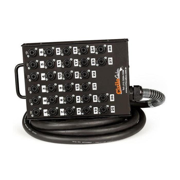 Medusa montada pela Cirilo Cabos com conectores Combo, marca própria. A vantagem do combo é poder plugar dois tipos distintos de conectores, o XLR e o P10 “plug banana”. Na ponta dos cabos vão conectores XLR macho. Este produto é ideal para transmissão de som profissional, sem prejuízos na qualidade ou interferência de ruídos externos.