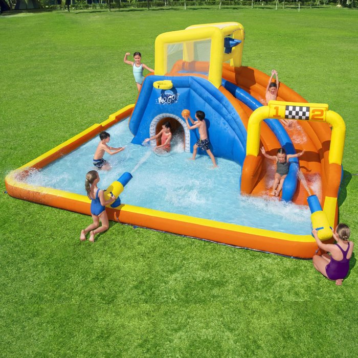 O Mega parque aquático inflável Bestway Raceway é diversão garantida! Vem com dois toboáguas, uma piscina, uma pistola de água conectada ao parque e uma parede de escalada, proporcionando horas de entretenimento para as crianças. O parque aquático infla em menos de dois minutos, permitindo sua montagem simples.