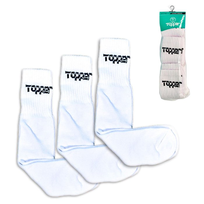 Para proteger os pés durante a prática esportiva, ou mesmo em ocasiões da rotina, o kit de meias de cano médio da Topper é uma excelente alternativa. Fabricadas em mescla de materiais leves, oferecem um tecido macio e respirável, possibilitando que você se caminhe sem perder o conforto. Composição: 79% Algodão, 20% Poliamida e 01% Elastano. Contém: 03 Pares nas cores branco. Cano: Médio (19 cm). Tamanho: 39 ao 42 Itens Incluso: 1 Kit Meia Topper Cano Médio 3 Pares