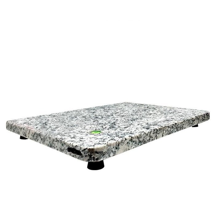 Fabricado em granito natural polido com cantos arredondados, possui bolha de nível e pés de borracha com amortecedor em poliuretando.